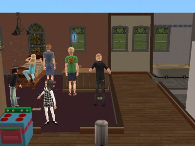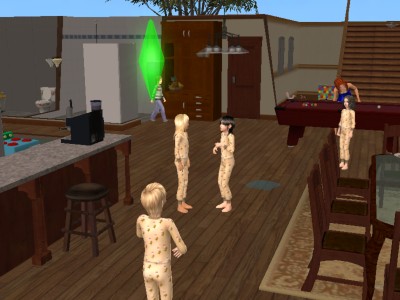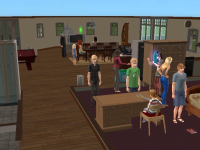 子供達はテレビに群がり、大人たちはビリヤード台に群がっています。