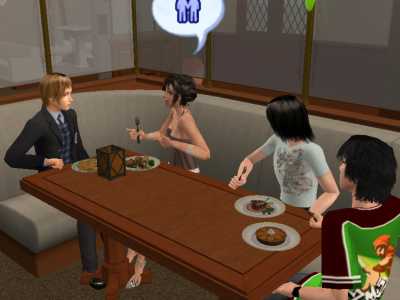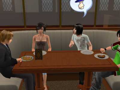 麻緒ちゃんはフライドチキン、素直君はフィレステーキ、衛君は桃のタルトレット、最後の子はクレープシュゼットを注文しました。