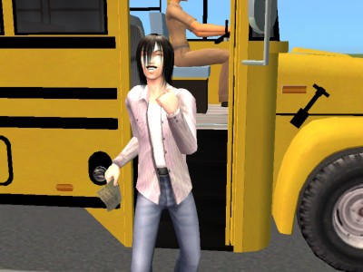 スクールバスを降りてガッツポーズ!